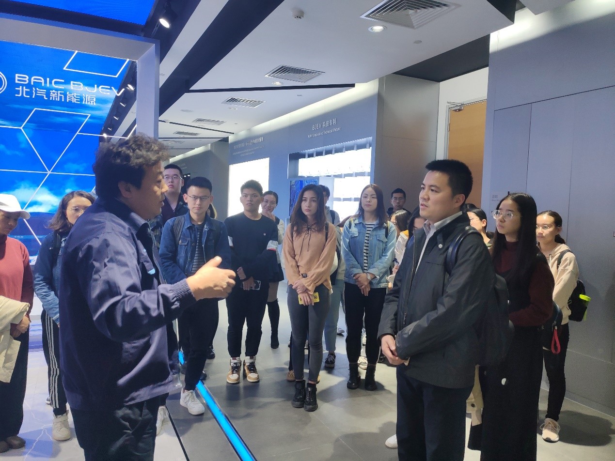 在与研发中心管理人员的交流提问中,同学们了解到,大家此次参观的地点——北汽新能源创新科技研发中心(中国·蓝谷),于2016年正式入驻亦庄经济技术开发区,其前身为诺基亚厂区。旧厂腾退、新厂进驻的发展历史引起了同学们极大的兴趣,在黄志基老师的引导下,大家结合自己的专业知识,积极发问。面对“政府的支持举措有哪些”、“税收分享机制如何”、“人才如何管理引进”、“未来投资方向如何”等问题,工作人员均给予了详细解答。北京亦庄协议收回原诺基亚厂区土地后,以“先租赁后入股”的模式与北汽合作,创建北汽新能源创新科技研发中心。在三环边没有花费巨额成本便获得了土地的使用权,可以视作政府对企业最优惠的扶持政策。北汽的生产基地基本分布在其他省份,有相当一部分税收上交给了地方政府。科研中心目前共两千名左右的科研人员,且每年会在全国范围内新招毕业生20-30余名。另外,整个厂区的改造过程也十分有趣:厂区前身为诺基亚所属,其建筑设计、施工标准、厂房质量等都在国内企业的平均水平之上,所以北汽新能源入驻之后,没有花费太多成本就在原有建筑基础上完成了改造;加之政府部门的大力支持,科研中心从签订合约到改造基本完成仅用时五个月,速度之快也令人称奇。