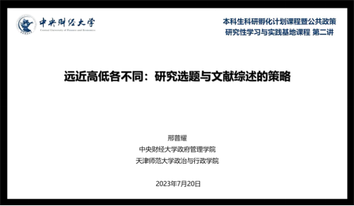 邢普耀老师以题西林壁中的“横看成岭侧成峰远近高低各不同”这句诗引入主题社科研究往往与“只缘身在此山中”的境遇相似因此承认研究的有限性才是研究的开始接着邢普耀老师介绍了研究选题的来源以及如何提出好的研究选题---问题很重要研究有缺陷双向有照顾下手确能做其中一个重要的问题可能是天然重要的也可能具有政策重要性和现实重要性研究有缺陷则代表着现有理论的不足或矛盾之处以及理论预期和现实预期不符并且一个好的选题既要满足理论问题的现实价值又要满足现实问题的理论关切最后邢普耀老师介绍了做文献综述的原因以及做提出问题型支撑自身观点/反驳他人观点型明确议题脉络型文献工作的具体方法为各团队提供了详细的选题和文献工作的指导
