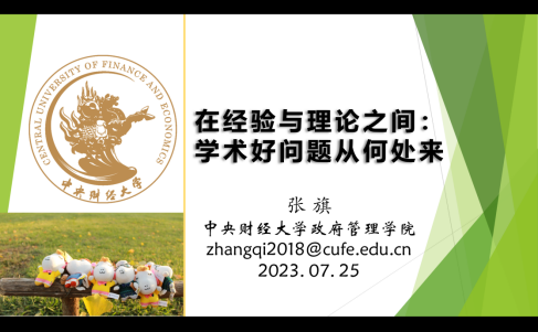 首先张旗老师提问什么是好的研究问题并引入了对何谓学术论文何谓科学研究何谓研究问题三个问题的辨析提出了“好问题”的标准——问题立得住、问题有学术价值和现实意义、既有回答不完善、具可证伪性、研究者可驾驭选题接着张旗老师提出对于经验困惑的思考和解决并举例详细讲述了看问题的思维方式先去关注经验事实并站在学术前沿联系相关理论以形成深刻的思考然后张旗老师用具体的例子讲述了理论经验不符的困惑最后张旗老师提出了选题重要且有趣的三个标准有重大现实意义有重大理论意义有吸引人的困惑并讲述了捕捉经验困惑的方法捕捉经验事实联想比较分析勤于思考发问和发掘理论困惑的方法精读专业经典书籍和专业前沿论文分析比较百家长短)。