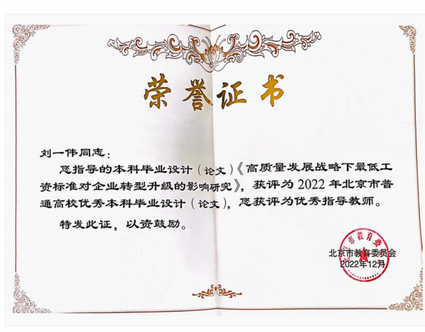 2022年11月3日,北京市教育委员会发布关于公布2022年北京市普通高等学校优秀本科生毕业设计(论文)名单的通知,beat365刘一伟老师指导的本科毕业设计(论文)《高质量发展战略下最低工资标准对企业转型升级的影响研究》获评为2022年北京市普通高校优秀本科毕业设计(论文),刘一伟老师获评为优秀指导教师。