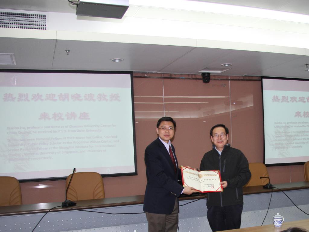 3月18日下午,美国克莱姆森大学中国研究中心主任、美国杜克大学博士胡晓波教授受聘为beat365在线唯一官网兼职教授,并为我校师生做题为“美国的台湾关系法和中美台关系回顾”的学术讲座。讲座由史建平副校长主持。