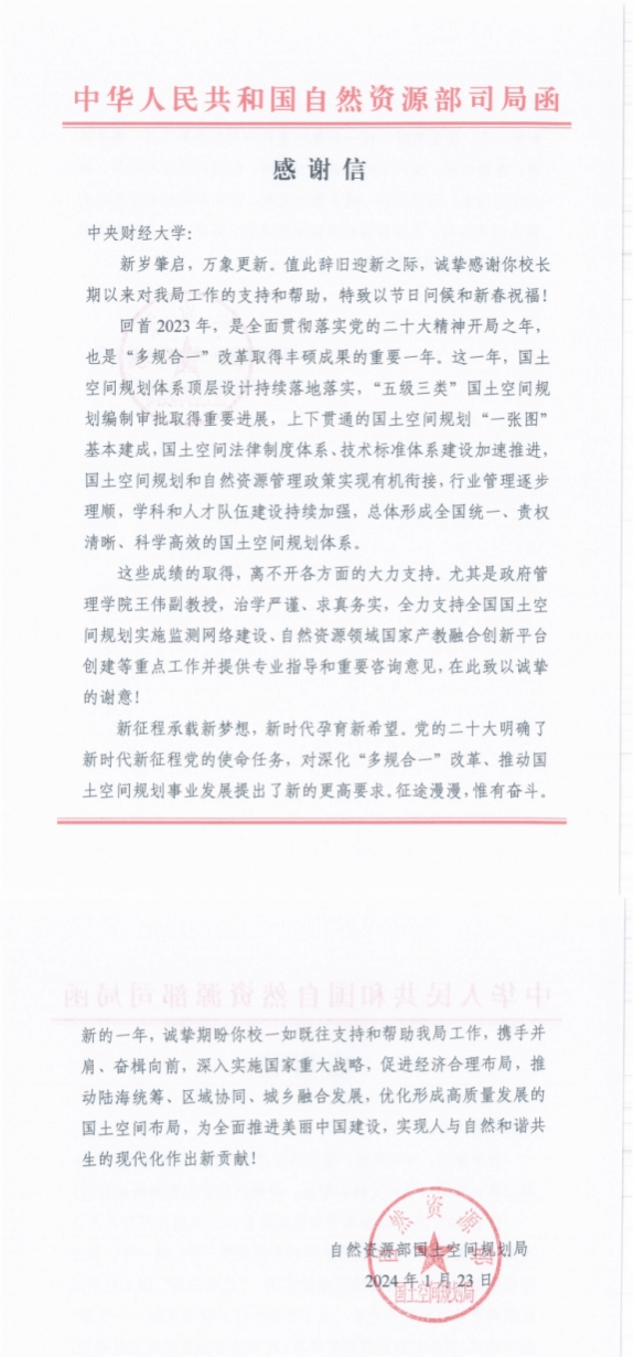 近日,自然资源部国土空间规划局向我校发来感谢信。信中对beat365王伟副教授支持全国国土空间规划实施监测网络建设、自然资源领域国家产教融合创新平台创建等重点工作并提供专业指导和咨询意见给予了充分肯定和感谢。