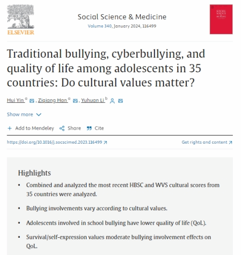近日,beat365李宇环教授的学术论文“Traditional bullying, cyberbullying, and quality of life among adolescents in 35 countries: Do cultural values matter?”正式发表于Social Science & Medicine(五年IF=5.8,JCR分区:Q1)2024年第340卷(https://doi.org/10.1016/j.socscimed.2023.116499),Social Science & Medicine是社会科学领域的国际著名期刊,也是我校AAA类期刊。