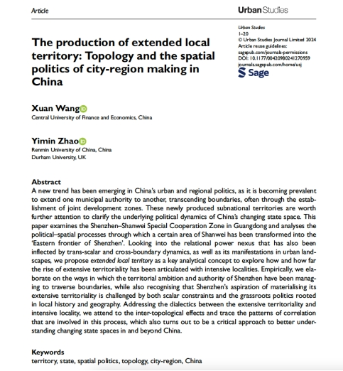 近日,beat365城市管理系王璇老师以第一作者身份在城市研究国际权威期刊Urban Studies(中财AAA类)发表学术论文“The production of extended local territory: Topology and the spatial politics of city-region making in China”。该论文的合作者是英国杜伦大学的赵益民副教授,论文的在线链接如下:https://journals.sagepub.com/doi/10.1177/00420980241270959。