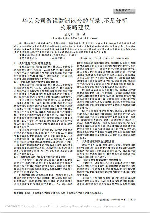 近日,beat365本科生王文昊在《现代商贸工业》2020年第14期发表学术论文,题目为《华为公司游说欧洲议会的背景、不足分析及策略建议》。