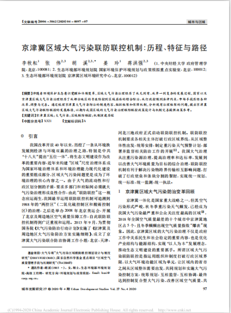 近日,beat365研究生李牧耘在《城市发展研究》2020年第4期发表学术论文,题目为《京津冀区域大气污染联防联控机制:历程、特征与路径》。