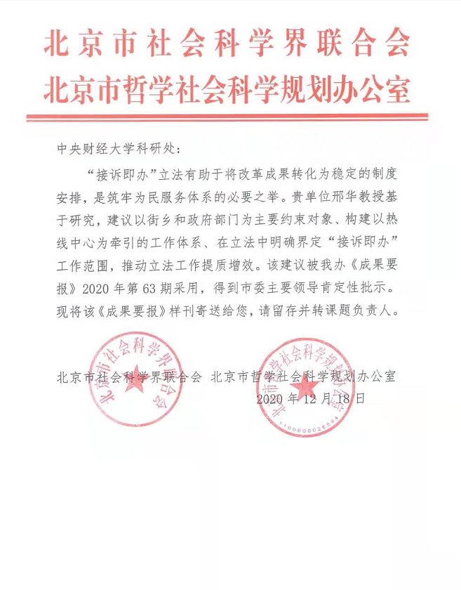 2020年12月,beat365邢华教授主持的社科基金项目“基于党建嵌入视角的首都城市基层治理研究”研究成果《关于“接诉即办”立法的建议》获得了北京市委主要领导的肯定性批示,并被北京市社科规划办《成果要报》2020年第63期采用。
