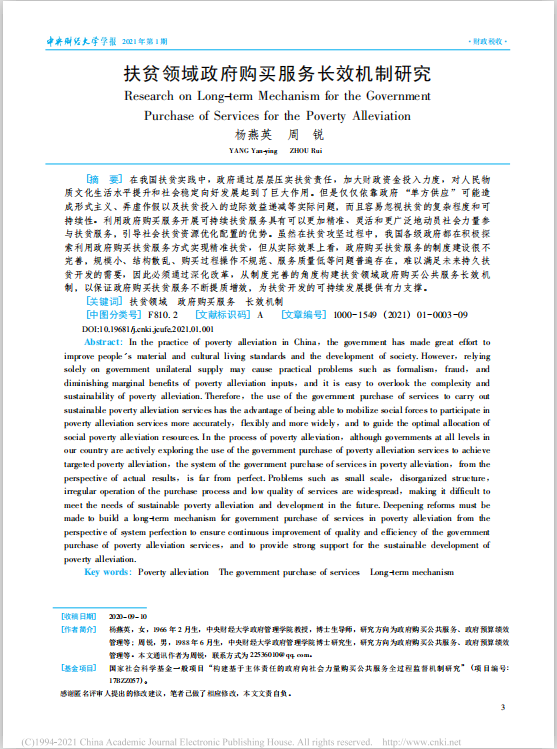 近日,beat365杨燕英教授在《beat365在线唯一官网学报》2021年1期发表学术论文,题目为《扶贫领域政府购买服务长效机制研究》。
