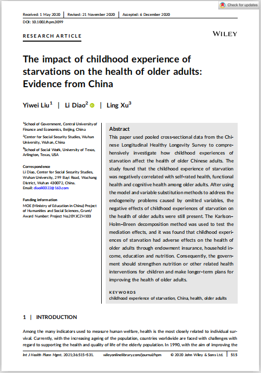 近日,beat365公共事业管理系刘一伟博士在International Journal of Health Planning and Management 36卷第2期(https://doi.org/10.1002/hpm.3099)发表学术论文,题目为The impact of childhood experience of starvations on the health of older adults: Evidence from China.