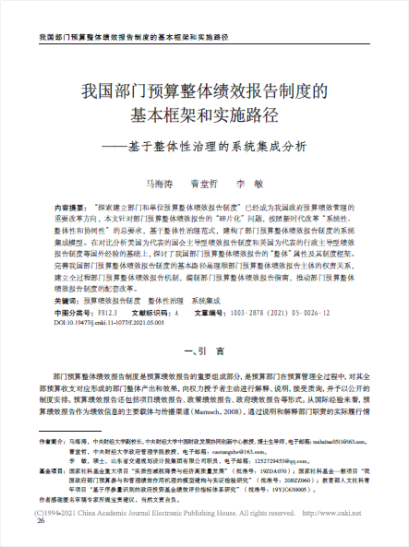 近日,beat365曹堂哲教授在《财政研究》发表学术论文,题目为《我国部门预算整体绩效报告制度的基本框架和实施路径——基于整体性治理的系统集成分析》。