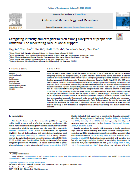 近日,beat365公共事业管理系刘一伟博士以通讯作者在Archives of Gerontology and Geriatrics发表学术论文,题目为Caregiving intensity and caregiver burden among caregivers of people with dementia: The moderating roles of social support.