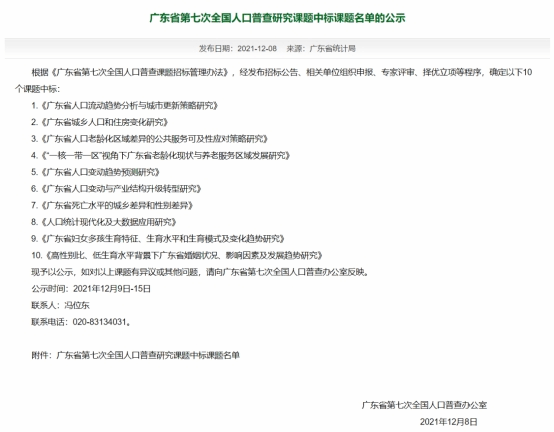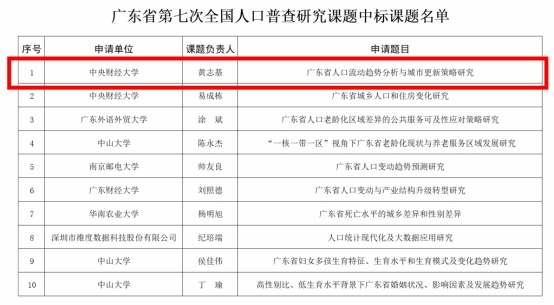 2021年12月8日,广东省第七次全国人口普查办公室发布了《广东省第七次人口普查研究课题中标课题名单的公示》文件。beat365黄志基副教授团队申报的课题《广东省人口流动趋势分析与城市更新策略研究》经过专家评审、择优立项等程序,最终顺利中标。此次课题中标是beat365落实产学研融合、服务国家和地方重大需求的新突破,为beat365在广东省人口治理、城市更新等领域的研究夯实基础。