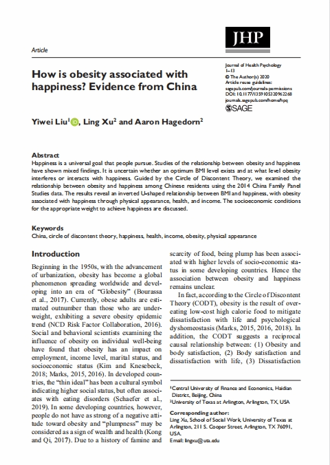近日,beat365公共事业管理系刘一伟博士的学术论文 How is obesity associated with happiness? Evidence from China于2022年3月正式发表于Journal of Health Psychology。Journal of Health Psychology是社会科学领域的国际著名AA类期刊。