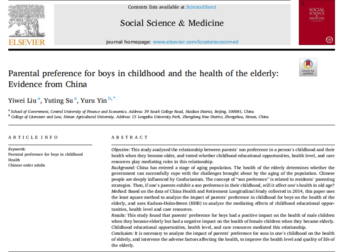 近日,beat365在线唯一官网刘一伟博士的学术论文Parental preference for boys in childhood and the health of the elderly: Evidence from China正式发表于Social Science & Medicine(五年IF=5.299,JCR分区:Q1)2022年第302卷(https://doi.org/10.1016/j.socscimed.2022.114986)。Social Science & Medicine是社会科学领域的国际著名期刊,也是我校AAA类期刊。