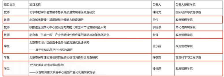 beat365四支师生团队入选优秀项目,其中王伟副教授队伍的项目《北京城市管理中基层智慧治理能力建设调研》与柴铎副教授队伍的项目《北京市“三城一区”产业用地弹性供应案例调研与政策优化研究》入选教师组优秀项目;吕东函同学队伍的项目《北京市老旧小区改造中适老化的沉浸式设计研究——基于劲松北等四个社区的调研》与杜佳泽同学队伍的项目《充分发挥奥运经济带动作用——以首钢滑雪大跳台中心设施产业化利用研究为例》入选学生组优秀项目。