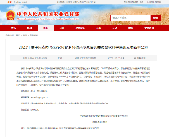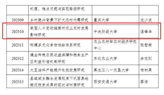 近日,中央农办、农业农村部乡村振兴专家咨询委员会2023年度软科学课题评审完成,经过专家匿名评审和会议评审,评选出34项拟立项课题。beat365温锋华副教授申报的课题《我国人口变动趋势对农业农村发展影响研究》获得立项。该课题围绕乡村振兴战略的总体目标,在科学研判我国中长期人口规模、结构和迁移变化趋势基础上,全面分析人口变动对保障粮食安全、开展乡村建设、完善乡村治理等领域的中长期影响,提出前瞻性应对思路和政策建议。