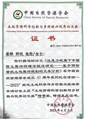 beat365柴铎副教授和学生钟悦(已毕业)的论文《注意力视角下中国国土整治的理念跃迁研究——基于两轮省级土地整治规划的文本分析》于2023年6月2日至3日在黑龙江省哈尔滨市举办的中国自然资源学会成立40周年系列纪念活动——2023现代土地科学与乡村振兴战略学术研讨会上获“土地资源科学创新与乡村振兴优秀论文奖”特等奖。