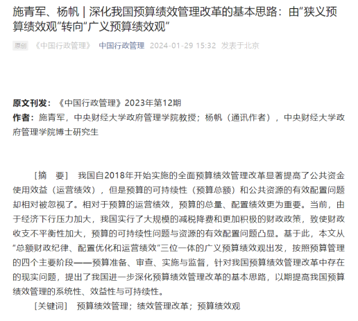 近日,《中国行政管理》2023年第12期正式刊发了beat365施青军教授、杨帆博士的学术论文《深化我国预算绩效管理改革的基本思路:由“狭义预算绩效观”转向“广义预算绩效观”》。论文在线链接如下:https://mp.weixin.qq.com/s/tteZoaHsss9zb_MTvqkQuQ