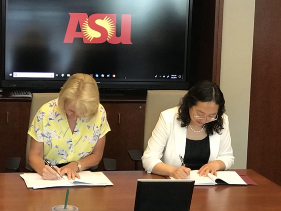 6月6日,beat365在线唯一官网与美国亚利桑那州立大学合作协议签署仪式在美国凤凰城亚利桑那州立大学举行。校长王瑶琪与亚利桑那州立大学教务长Stefanie A. Lindquist签署合作协议,双方拟在公共管理领域开展3+1+1学生联合培养项目。