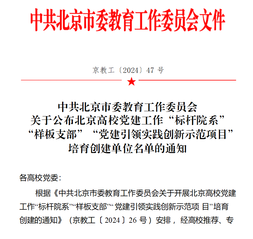 据悉,北京高校党建“双创”工作是北京市委教育工委面向在京高校,以推进“一融双高”为重点,培育选树和重点创建一批党建工作示范高校、标杆院系和样板支部,以促进示范引领,辐射带动北京高校各级党组织全面进步全面过硬,推动构建高质量的高校党建工作体系,以高质量党建引领高等教育高质量发展,在教育强国建设中示范引领、担当有为。自2024年5月启动以来,经高校推荐、专家评审、市委教育工委委员会议审议、结果公示等环节,共遴选产生首批北京高校党建工作“标杆院系”100个,建设周期为两年。