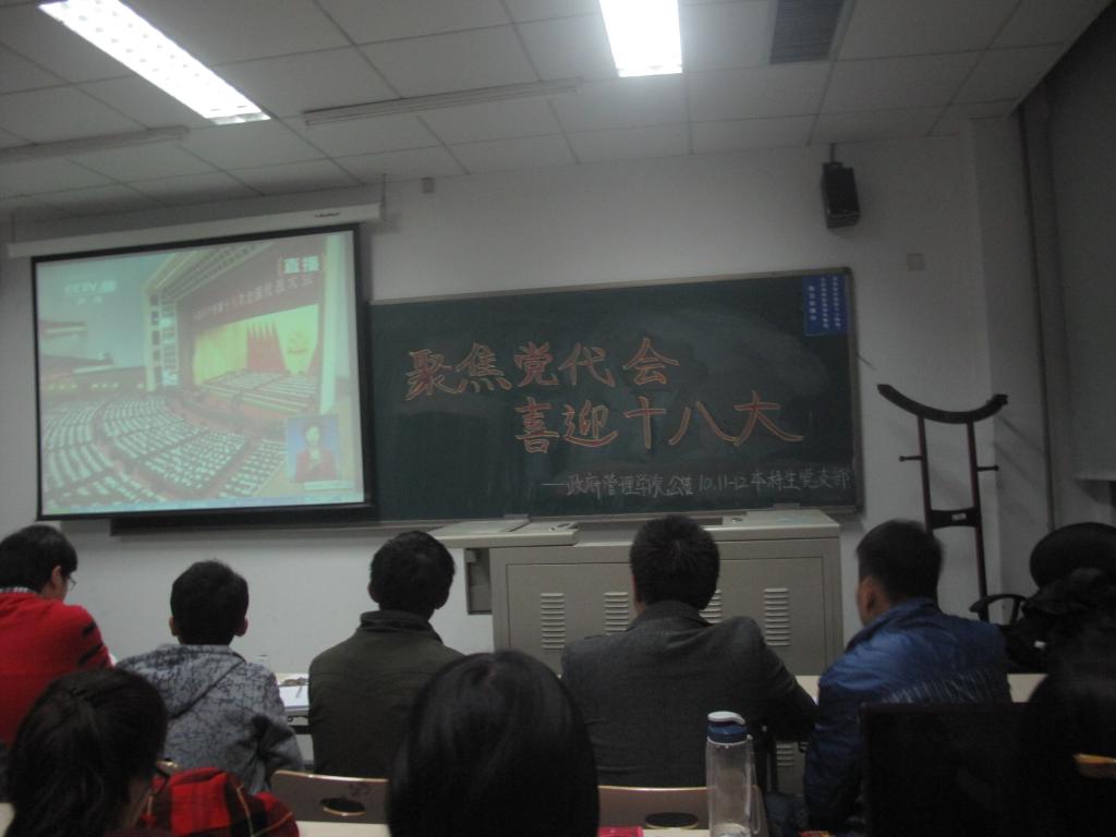 为认真学习党代会精神,2012年11月8日晚上七点,beat365在线唯一官网10公管本科生党支部及11、12级本科生党支部在学院3号楼218教室举行了主题为“聚焦党代会喜迎十八大”的党代会观看活动。本次活动由10公管党支部副书记徐世黔同学主持,共有三个年级27名党员、预备党员以及部分入党积极分子参与。通过观看大会,大家更加深入地认识到我党不断发展与时俱进的进取精神和求真务实的工作作风。