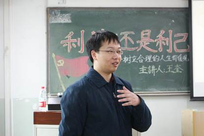 党课伊始,王奎老师首先向发展对象介绍了本次党课的选题意义。他提出,关于人生观、世界观、价值观的问题是同学们自小就讨论和面对的话题,已经不算新鲜。但是,随着新时代的来临和人民物质生活水平的提高,社会环境和人们的思想意识已悄然发生变化,越来越多关于“90后、00后‘利他’意识淡薄”的批评见诸报端。党的十九大指出,“必须推进马克思主义中国化时代化大众化,建设具有强大凝聚力和引领力的社会主义意识形态,使全体人民在理想信念、价值理念、道德观念上紧紧团结在一起。”因此,在当前的社会背景及十九大报告对社会主义意识形态的指引下,再次讨论“利己”或“利他”这一价值观问题,对于新时代青年,尤其是积极向党组织靠拢的先进青年,具有十分重要的意义。