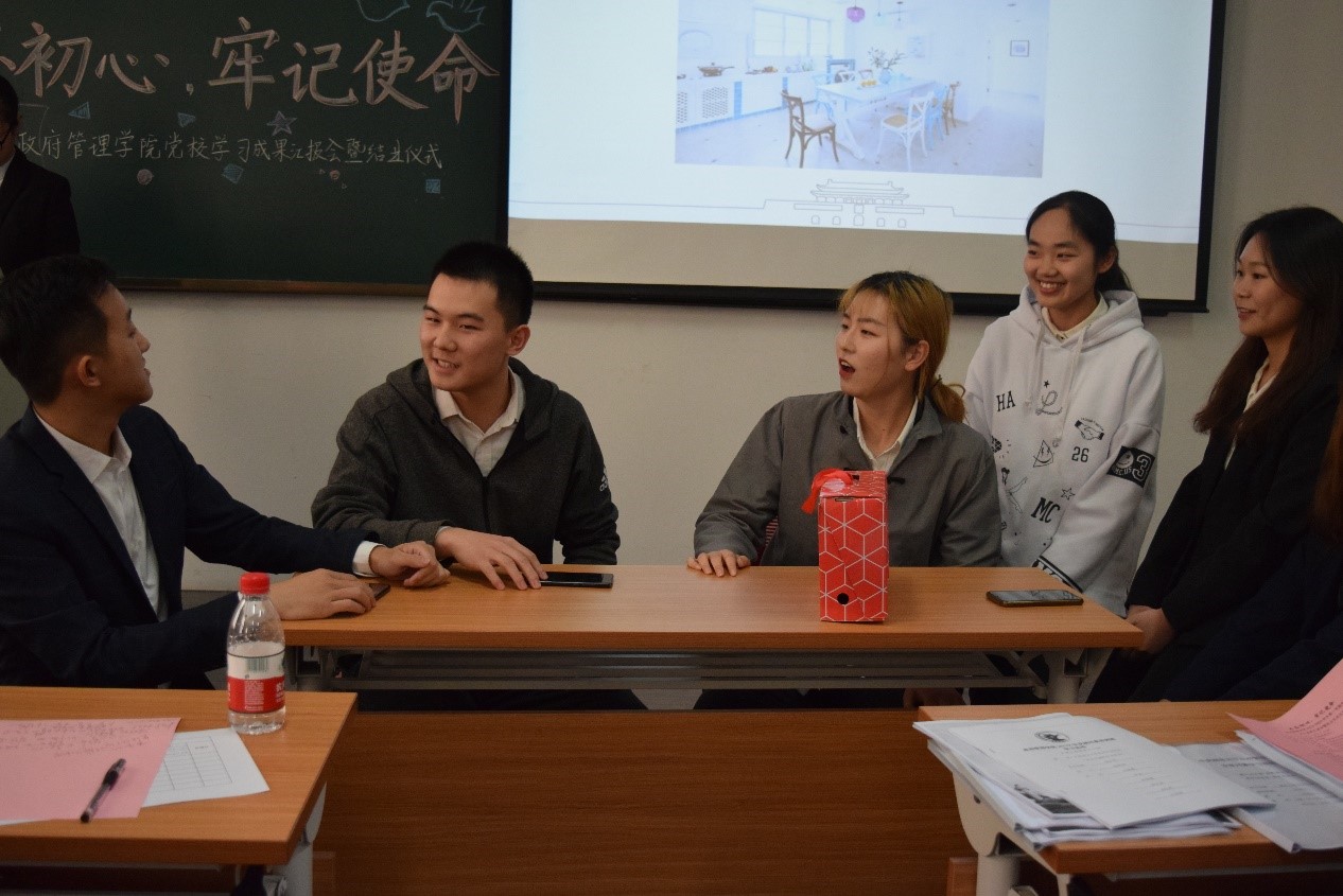为培养先进的青年马克思主义者,使青年筑牢理想信念,时刻铭记中国共产党“为中国人民谋幸福,为中华民族谋复兴”的初心使命,牢记中国共产党全心全意为人民服务的宗旨,beat365在线唯一官网2019-2020学年党校如期开课。党校致力于培养勇于担当负责,积极主动作为的社会主义事业建设者和接班人。一个多月的学习转瞬即逝,2019年11月27日,beat365在线唯一官网党校暨学习成果汇报暨结业仪式在中财大厦案例教室6隆重举行。党校副校长白云真老师,副院长张剑老师,组织员南琪老师,党委委员李海明老师,学生工作办公室、党校办公室主任张小林老师,2017级、2019级辅导员李磊老师出席本次会议,2019-2020学年党校全体成员参会。