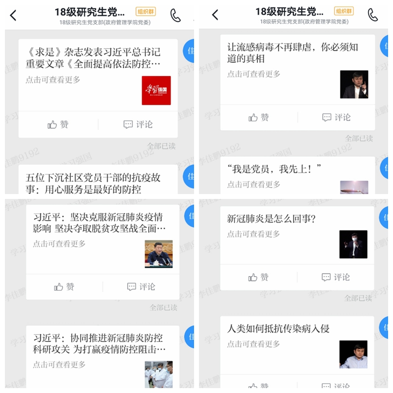 在开展主题党日活动正式前,经支部委员会商议,组织全体党员利用3月10日-3月12日2天的时间,线下组织开展三个方面的认真学习:一是认真学习习近平总书记有关新冠肺炎疫情防控的重要讲话精神;二是认真学习党中央、国务院和学校党委有关疫情防控的工作部署,三是认真学习在防控新冠肺炎前线中涌现出来的先进事迹和榜样力量。支部书记李佳鹏、宣传委员牛鑫分别负责学习强国支部组织群、支部微信群上传上述相关学习资料。支部党员通过在家线上灵活自主学习,有效增强党员对疫情防控的严峻性、严重性和艰巨性的认识,有效引导支部党员关心关注疫情动态、正确认识疫情防控防范。