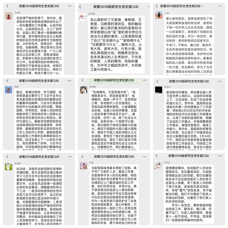 为严格贯彻落实习近平总书记关于疫情防控工作的重要指示精神,确保支部全体党员在思想上政治上行动上同党中央、国务院决策部署和学校党委、学院党委工作要求保持高度一致,beat365在线唯一官网2018级研究生党支部在3月13日开展了 “同心抗疫、共克时艰”线上主题党日活动。