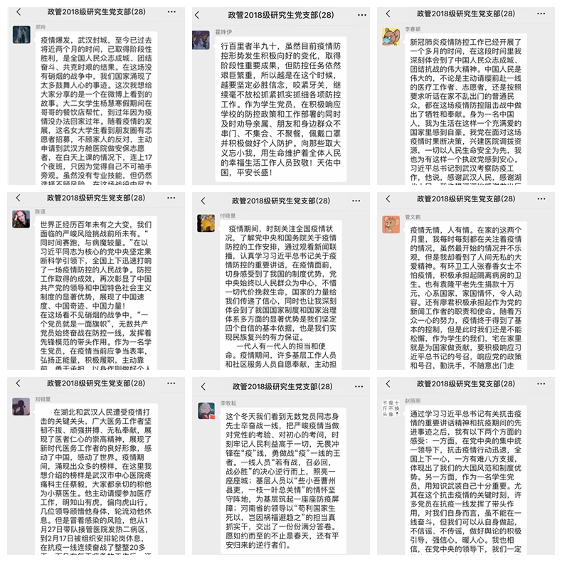 马蕾同志:当前我国疫情基本得到了控制,离不开广大医护人员、基层工作者、志愿者等许多人的无私奉献,相信我们在座的各位居家写论文的时候也遇到过上门量体温的社区工作者,他们任劳任怨、辛苦付出、勇于承担责任的品质让人感动和敬佩,前段时间由于写论文我没有参与社区志愿活动我感到非常遗憾,作为一名党员我只是防护住了自身而没有做到更多,我心怀歉疚,只能向奋战在一线的工作人员和志愿者致敬和表达心中的感激之情,当然这也激励我向他们学习,在接下来的工作和生活中努力践行为人民服务的宗旨,勇于承担自己的社会责任,做一名心系家与国的合格党员。