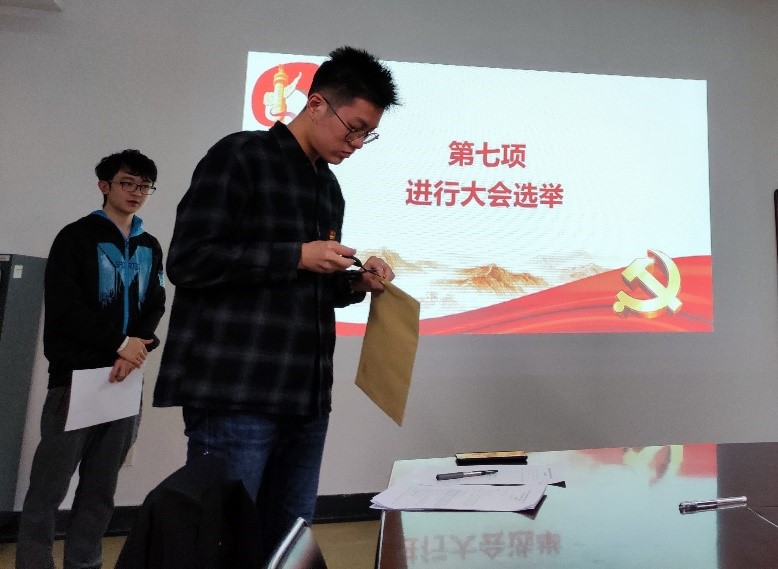由总监票人张栋同志主持选举beat365在线唯一官网本科生党支部新一届委员会委员。本次选举发放选票8张,有效选票8张,李莎莉同志获赞成票7票,陈建军同志获赞成票7票,严其姝同志获赞成票4票,王文昊同志获赞成票6票。大会选举李莎莉、陈建军、王文昊三位同志为支部委员,选举结果有效。