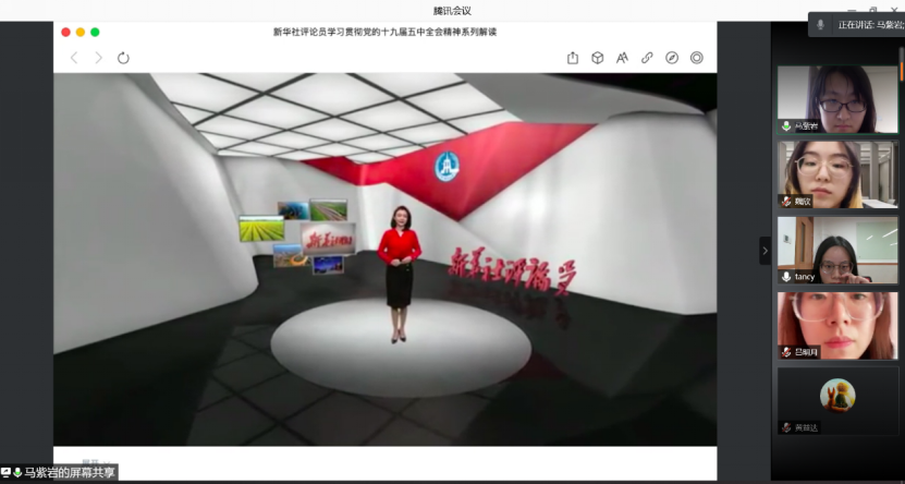会议伊始,学员们一起线上观看了新华社“学习贯彻党的十九届五中全会精神”系列评论,视频通过“为夺取全面建设社会主义现代化国家新胜利而奋斗”、“构建新发展格局,实现高质量发展”、“坚定不移深化改革扩大开放”、“弘扬核心价值,坚定文化自信”、“促进人与自然和谐共生”、“促进人的全面发展和社会全面进步”、“筑牢安全屏障,建设平安中国”、“坚持党的全面领导,坚决落实党中央部署”、“开拓新发展阶段的美好前程”等九个专题详细阐述了十九届五中全会所提出的核心精神。学员们通过视频学习更加全面了解了当前我国所面临的国内外形势和发展阶段,以及“十四五”时期发展的新目标、新形势和新挑战。