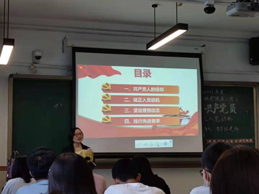 李宇环老师首先启发同学们思考“共产党人的信仰是什么”。她从《觉醒年代》中奋起救国的前辈,讲到“倾心为国志无违”的朱德同志的入党之路,再谈到疫情中无私奉献、倾情奉献的年轻党员。通过从古至今优秀党员的事迹,李老师强调对理想信念的坚守、对社会主义的信念是共产党人的政治灵魂,共产党人的信念需要落实在为人民服务、奉献的过程中,需要在实践中不断地筑牢。