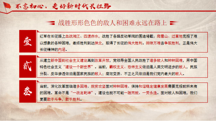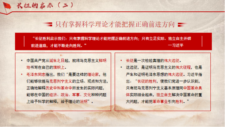 至此,本次党课接近尾声。在本次党课中,学员们回顾了二万五千余里的长征路,感受了革命先辈们为革命胜利做出的巨大牺牲,并被伟大的长征精神所感染,自发地思考如何继承长征精神,将其内化于心,外化于行,走好个人的长征路,推进时代的长征路。期望学员们能在今后继续保持党史学习的习惯,知党恩、跟党走,在党史学习中坚定理想信念,不忘初心,继续前行!
