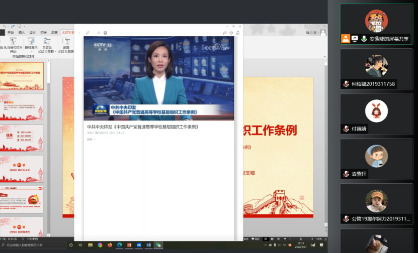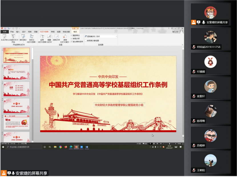 2022年3月27日晚,beat365在线唯一官网本科生党支部公管国政小组通过腾讯会议的方式,在线上开展关于《中国共产党普通高等学校基层组织工作条例》(以下简称《条例》)专题学习会议,会议由安紫婕同志主持。