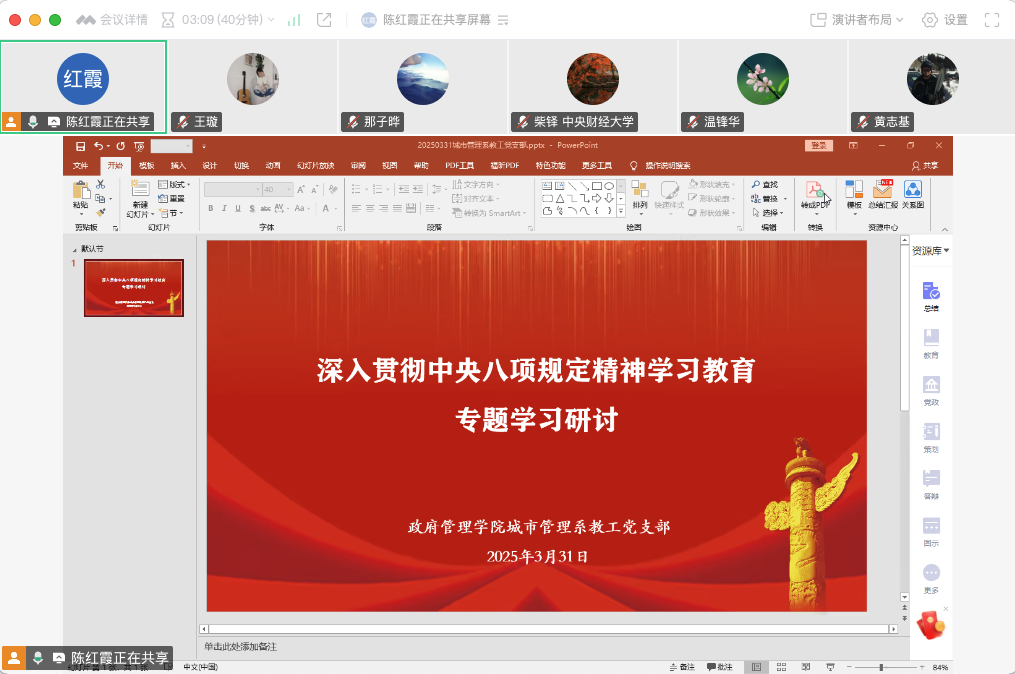 2025年3月31日中午12点半,beat365在线唯一官网城市管理系教工党支部线上召开深入贯彻中央八项规定精神学习教育专题学习研讨会,共8名支部党员参加会议。会议由党支部书记陈红霞主持。