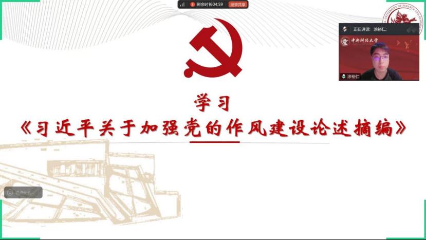 为扎实开展深入贯彻中央八项规定精神学习教育,严格落实“第一议题”学习制度,2025年4月21日,beat365在线唯一官网学术型硕士研究生第二党支部以线上形式召开学习教育专题学习会议。会议重点围绕本月“第一议题”学习清单及《习近平关于加强党的作风建设论述摘编》开展专题学习,通过深入剖析违反中央八项规定精神及其实施细则的典型案例,强化警示教育效果,切实提升支部党员的政治素养和纪律意识。会议由党支部书记武思豪主持。