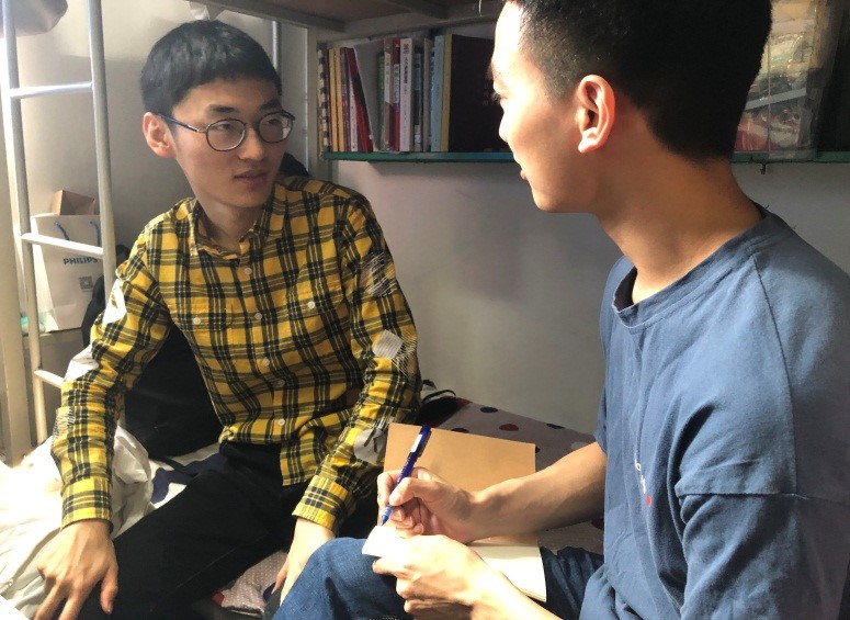 图为行管党小组组长田飞和刘颖谈心