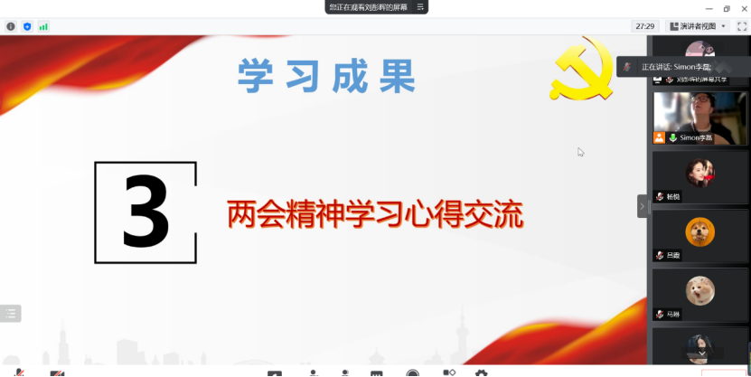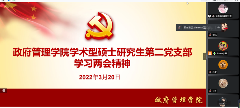 随后支部成员开始分享对今年全国两会以及政府工作报告相关内容的心得体会。支部组织委员吴睿同志表示,作为一名教育经济与管理专业的研究生,在2022年两会中特别关注了教育领域的相关热点话题和议案。继续稳步推进教育“双减”、大力提升课后服务质量、贯彻实施《家庭教育促进法》和切实打造乡村教育的未来都是未来一年我国需要在教育领域不断完善的地方,也希望自己的学习能对我国实际理解更深,并贡献出自己的青春才智。