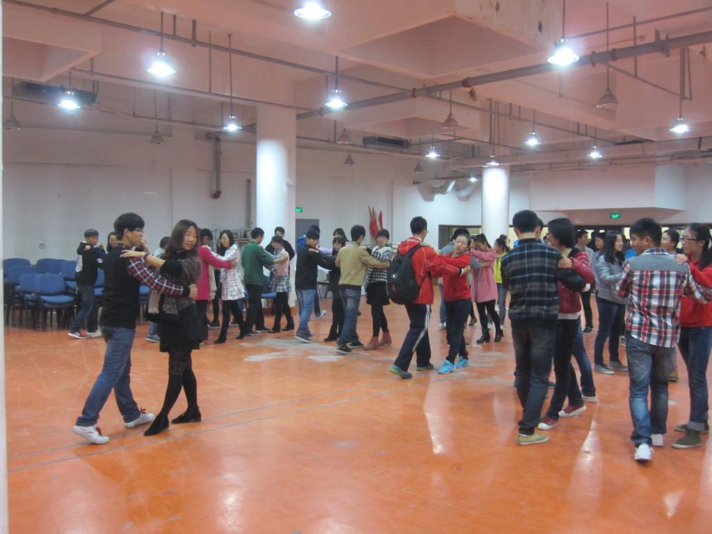 起初,舞蹈老师进行分节式教学,让同学们先熟悉掌握动作要领,“踮起脚尖,提起裙边”。虽然大家的舞步不是很熟练,但进步仍是有目共睹的。随后的环节中,大家开始自由选择舞伴,多数男生、女生很快找到了自己心仪的“另一半”。但是由于此次参与培训人员的比例不均衡,所以部分女生没有找到男舞伴。尽管如此,她们依然练得十分认真,细细揣摩着每一个步伐,每一个节拍。培训会在非常轻松的氛围下进行着,大家不知不觉中就已经掌握了交谊舞的基本步法。这时,缓缓的华尔兹舞曲响起,大家伴着动听的音乐,跳得更加流畅和享受。