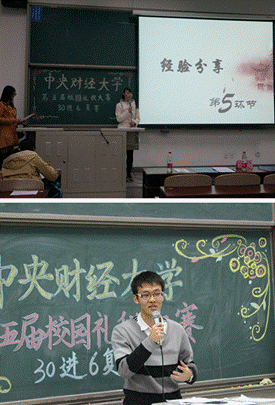 本次大赛设置了必答题、情景模拟题、主题演讲和视频纠错题四个环节。必答题环节中每支参赛队伍按出场顺序上台答题。题目涉及到中外商务礼仪、社交礼仪以及外事礼仪,这对选手们是个不小的考验,不少题目让选手们感觉模棱两可甚至闻所未闻。队员们面对颇有难度的题不时出现莫衷一是的情形。场下的其他队伍也在认真地讨论题目,时而皱眉,时而自信微笑,时而恍然大悟,时而了然莞尔。情景模拟环节中,每支队伍根据事先抽到的题目进行情景模拟。模拟的场景有接待商务伙伴夫妻的晚宴、参加公司周年会、两国领导签协议、接待外国领导人访问团队等等。通过情景模拟,大家认识到了很多在现实生活中需要注意的礼仪细节,增长了知识。主题演讲环节是由每支队伍派出一人根据抽到的题目进行时长一分三十秒的演讲。演讲的主题有国无礼则不策、非物质文化遗产与现代文化、中国学生与西方学生谁更优秀、墙等等。从选手们落落大方的演讲中,我们看到了新一代大学生活跃的思维,敏锐的视角以及对现实的关注和思考。最后一个视频纠错环节为所有队伍一起观看视频,找出其中不符合礼仪的行为。各位参赛选手都目不转睛地观看视频,生怕错过任何一个小细节。