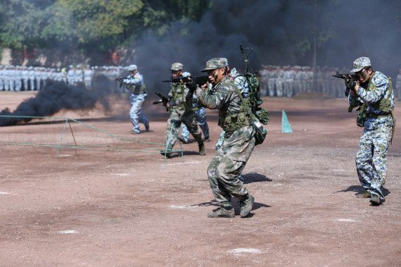 而战术训练队的同学也在做最后的突击。不断地练习匍匐前进,练习格斗,操场上的碎石硌破了手肘,他们却依然秉持 “流血流汗不流泪”的精神,向同学们展示着一个战士应有的钢铁意志。