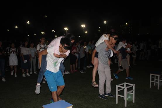 按照规则,16级新生共分为“你”“我”“有”“缘”“相”“聚” “在”“中”“财”“政”“管”十一个小组,在班级助理、“芮+”导师和15级同学的带领下进行游戏和互动。在小组活动环节,组内成员在领到各自名牌后首先进行了自我介绍。紧接着的传递记名游戏使同学之间更加熟悉,现场气氛也更加融洽。而后进行的“一块钱两块钱”、“报数”、“虎克船长”等游戏将活动推向高潮。输了游戏的同学接受各种各样的惩罚,唱歌、跳舞、真心话、大冒险…在亲密的互动和交流中,同学之间的距离感不复存在,他们一同欢笑,其乐融融。小组活动之后,十一个队伍又进行了“你画我猜”、“瞎子背瘸子”的游戏比赛,队员们相互合作,都想努力为自己的队伍赢得奖励。夜幕悄然降临,此次破冰活动也在一片欢声笑语中结束。此刻,输赢已不那么重要,而同学们能够在游戏中互相了解与熟识才是这次活动的真正意义。