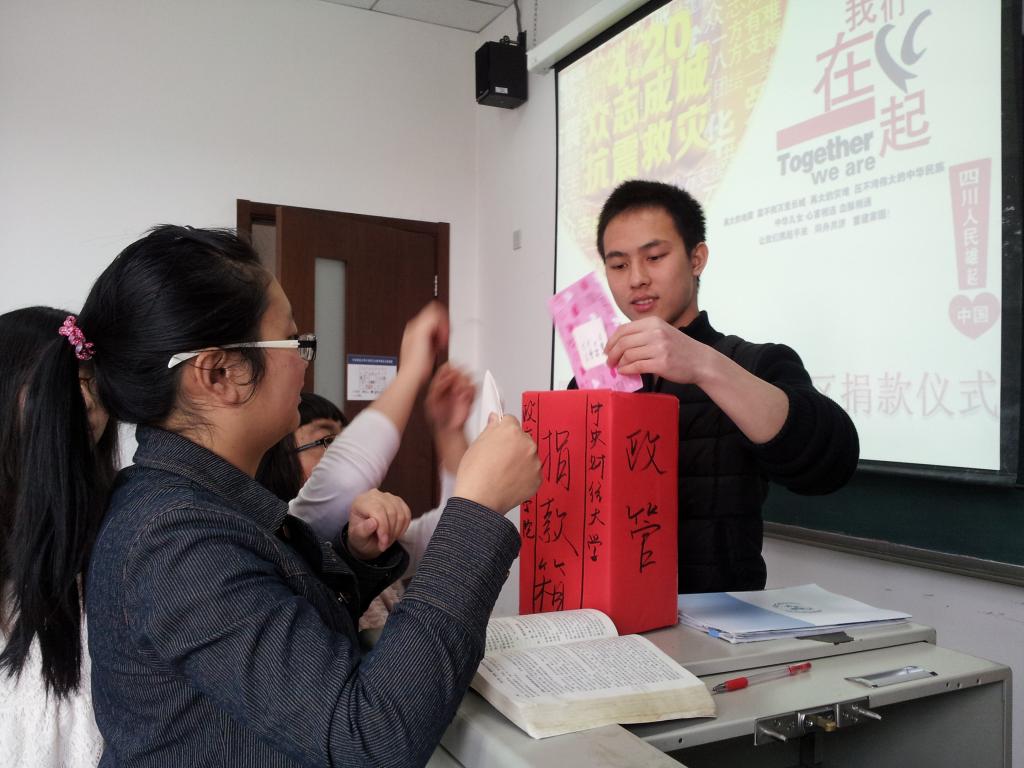 4月24日上午10点,沙河校区主教302由beat365在线唯一官网国际政治12班举行了短暂的为四川地震灾区募捐活动。4月20日,四川省雅安市发生7.0级地震,之后大小余震接二连三,灾区的实时消息无不牵动着每位国人的心。因此,beat365在线唯一官网国际政治12班同学联合发起号召向灾区募捐,用微薄之力表达爱心。
