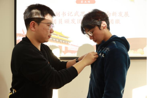 仪式第五项,团委副书记武思豪老师、团委学生副书记薛涵月向新发展团员颁发团章、佩戴团徽。