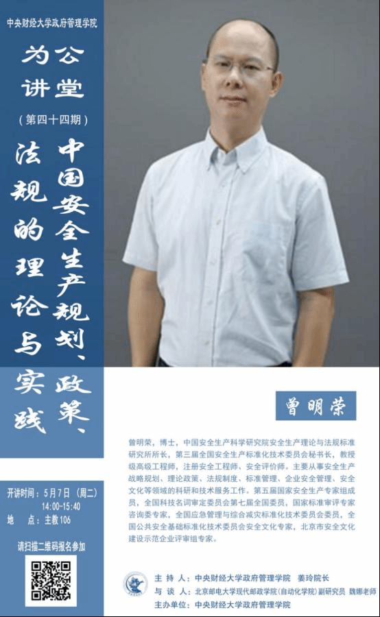 嘉宾简介:曾明荣,博士,中国安全生产科学研究院安全生产理论与法规标准研究所所长,第三届全国安全生产标准化技术委员会秘书长,教授级高级工程师,注册安全工程师、安全评价师。主要从事安全生产战略规划、理论政策、法规制度、标准管理、企业安全管理、安全文化等领域的科研和技术服务工作。第五届国家安全生产专家组成员,全国科技名词审定委员会第七届全国委员,国家标准审评专家咨询委专家,全国应急管理与综合减灾标准化技术委员会委员,全国公共安全基础标准化技术委员会安全文化专家,北京市安全文化建设示范企业评审组专家。