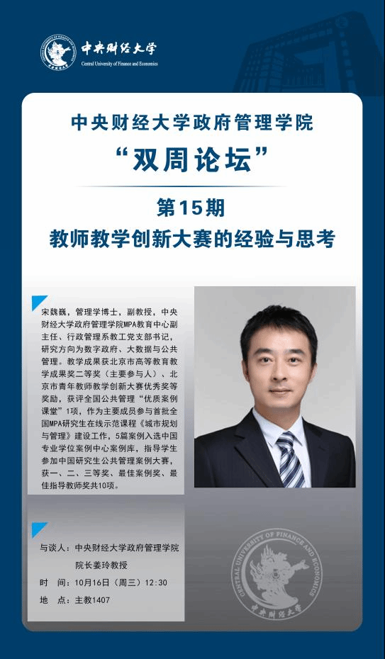 主讲人简介:宋魏巍,管理学博士,副教授,beat365在线唯一官网MPA教育中心副主任、行政管理系教工党支部书记,研究方向为数字政府、大数据与公共管理。教学成果获北京市高等教育教学成果奖二等奖(主要参与人)、北京市青年教师教学创新大赛优秀奖等奖励,获评全国公共管理“优质案例课堂”1项,作为主要成员参与首批全国MPA研究生在线示范课程《城市规划与管理》建设工作,5篇案例入选中国专业学位案例中心案例库,指导学生参加中国研究生公共管理案例大赛,获一、二、三等奖、最佳案例奖、最佳指导教师奖共10项。