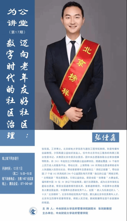 嘉宾简介:张佳鑫,工学博士,北京邮电大学信息与通信工程学院教师,科普传播专业副教授,夕阳再晨公益组织发起人,任中共北京市社工服务机构第三联合党委书记、共青团北京市委员会委员、团中央志愿服务联合会常务理事等职务。自2011年起创立夕阳再晨公益品牌项目,搭建起覆盖16个省市上百万老人的服务平台,带动北京、上海等地100所高校志愿者帮助老年人快速融入信息化社会。带动首都青年志愿者创立“高校正能量”,带动全国27个省102所高校的206个公益团队每月开展“指尖的公益”网络文明、“文明旅游”等志愿服务。引领公益创业,荣获全国“创青春”大赛金奖,福布斯中国30位30岁以下创业精英 ;践行志愿服务,成为北京市首批五星级志愿者,荣获全国道德模范提名奖、首都道德模范、中国青年志愿服务大赛全国金奖、中国青年志愿者优秀个人、全国“助人为乐身边好人”、十大“北京榜样”、北京市高校优秀共产党员、第九届北京市优秀青年人才、北京市五四青年奖章等荣誉,得到人民日报、新闻联播等全国千余家媒体的报道。