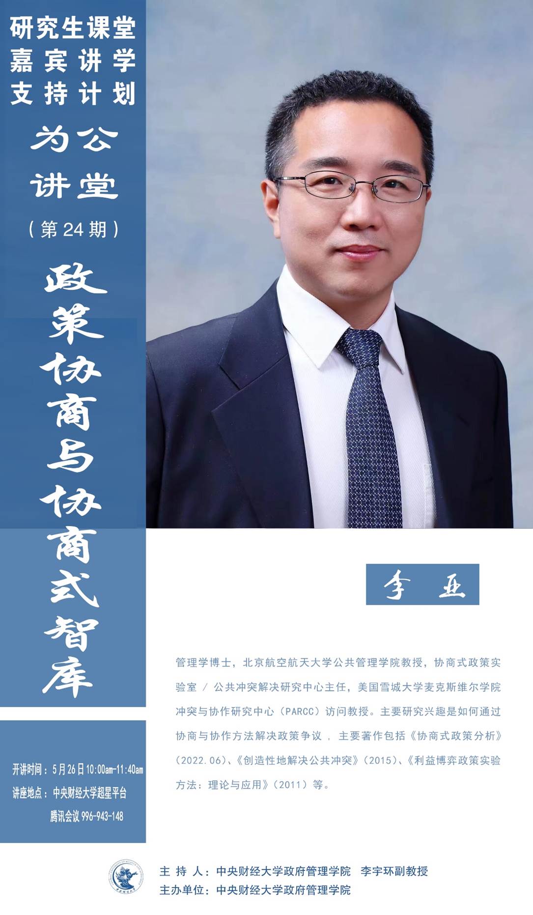 嘉宾简介:李亚,管理学博士,北京航空航天大学公共管理学院教授,协商式政策实验室/公共冲突解决研究中心主任,美国雪城大学麦克斯维尔学院冲突与协作研究中心(PARCC)访问教授。主要研究兴趣是如何通过协商与协作方法解决政策争议,主要著作包括《协商式政策分析》(2022.06)、《创造性地解决公共冲突》(2015)、《利益博弈政策实验方法:理论与应用》(2011)等。