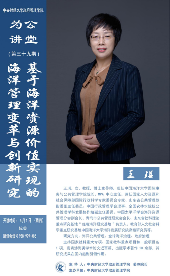嘉宾简介:王琪,女,教授,博士生导师,现任中国海洋大学国际事务与公共管理学院院长、MPA中心主任。兼任国家人力资源和社会保障部国际行政科学专家委员会专家、山东省公共管理教指委副主任委员、中国行政管理学会理事、全国农林水院校公共管理学科发展协作组副主任委员、中国太平洋学会海洋资源管理分会副会长、青岛市公共管理研究会会长、山东省社科理论重点研究基地“经略海洋研究基地”负责人、教育部人文社会科学重点研究基地中国海洋大学海洋发展研究院高级研究员等。